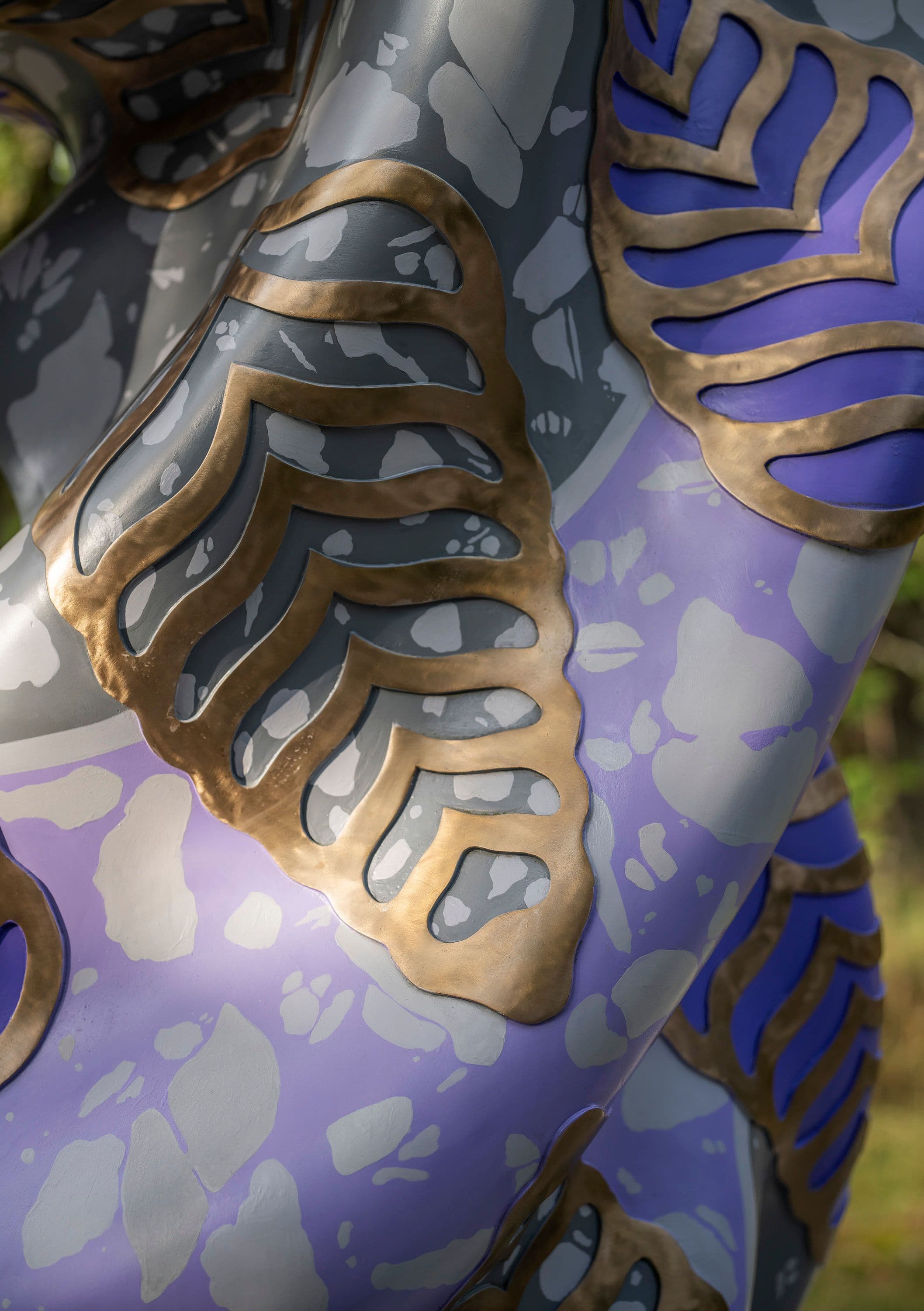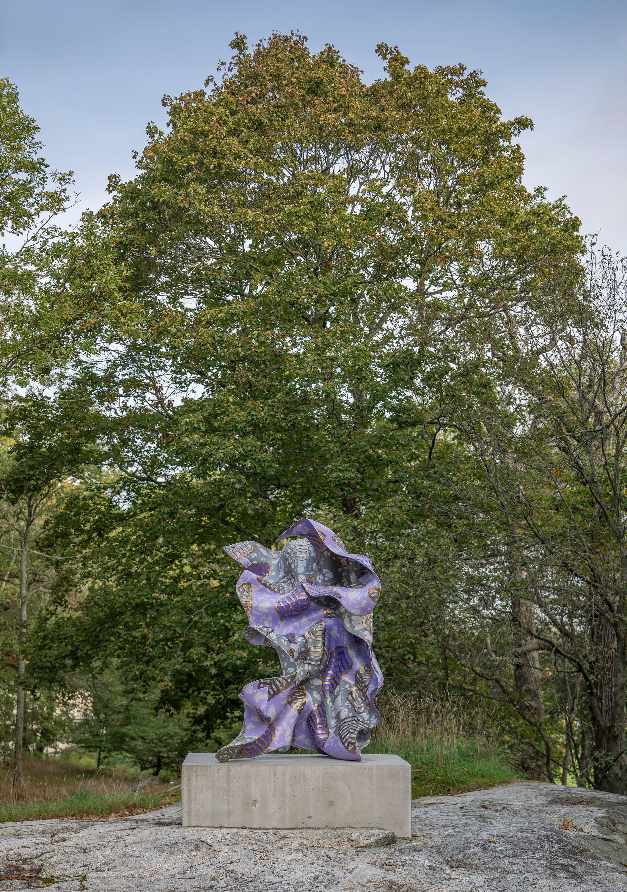 Shonibare’s sculpture for the Princess Estelle Sculpture Park on Royal Djurgården is a development of this Wind Sculpture series and an attempt to capture the weightlessness of air in solid, heavy bronze. The sculpture is hand painted in purple hues with a raised abstracted leaf pattern that exposes the natural colour of the bronze patina.