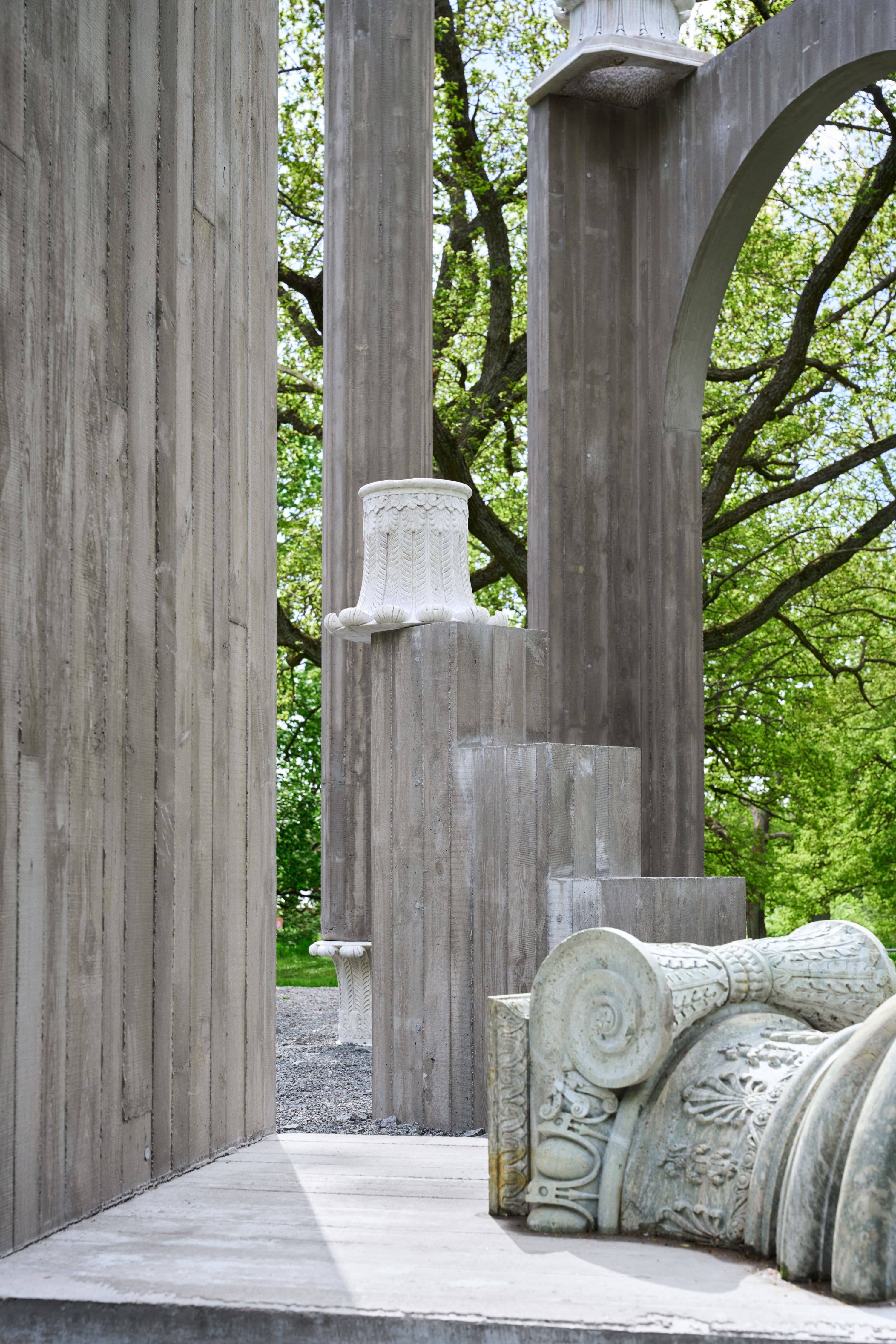Sosnowska's monumental sculpture Museum draws its inspiration and material from an intended art museum for Rosendal, initiated by King Karl XIV Johan in the 1830s. Despite ten years of planning, the museum never materialised, but hundreds of marble pieces were ordered and have since been stored. Eleven of the nearly 200-year-old original pieces, initially intended to adorn the museum's facade and interior, are now integrated into an open installation. They balance on top of, lean against, and pierce concrete structures reminiscent of various building fragments – a wall section, a portal, a pillar or a staircase. The marble's smooth surface and carefully carved details contrast sharply with the rough-cast concrete. Past meets present in a sculpture that lies in the borderland between architecture and art.