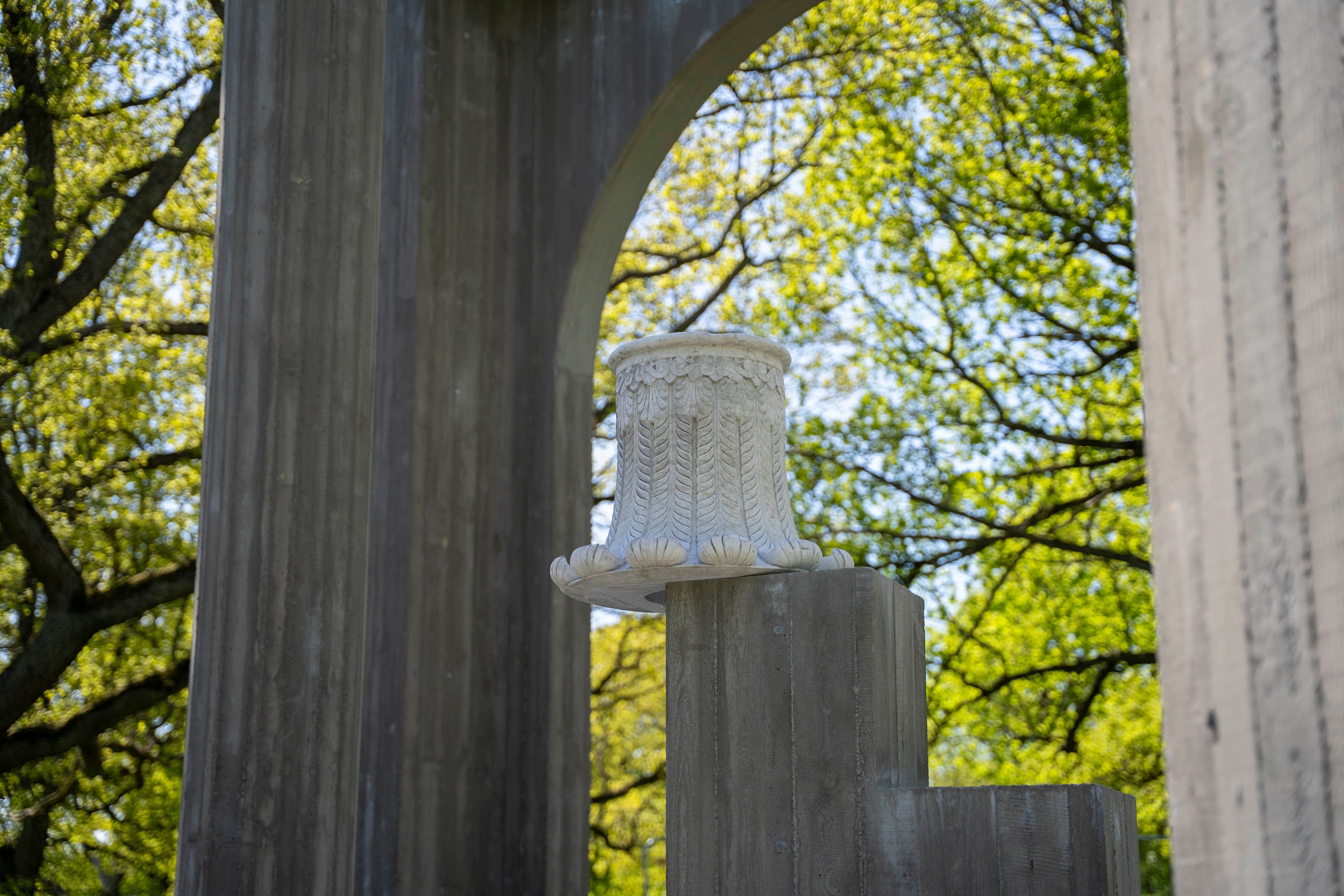 Sosnowskas skulptur bildar ett rum, omringat av den anlagda parken på höjden Rosendalsterrassen. Skulpturen står på ett ojämnt grusunderlag där vilda växter tränger fram. Är det under uppbyggnad eller en ruin av museet som aldrig blev av?